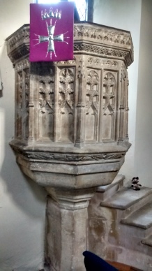The pulpit is a beautiful example of 15th Century stonework and is said to be carved by a travelling band of masons from stone quarried in Caen, Normandy.