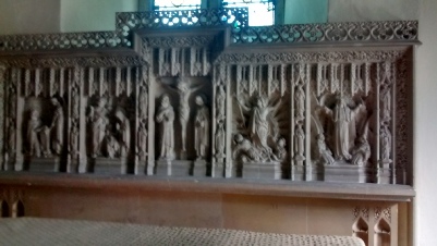 The reredos in the sanctuary, depicting the Annunciation, Nativity, Crucifixion,